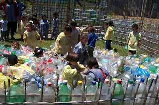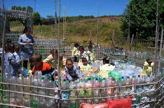 Mas apesar de todo o típico temos algo de atípico: um projeto de CONSTRUÇAO DE CASAS COM GARRAFAS PET. Sim, meu marido faz casas, e em lugar de tijolos usa garrafas PET. A casa fica muito boa, quentinha no inverno e fresquinha no verão, resistente e linda. As garrafas vão cheias de ar cada uma com sua tampinha. Sai muito barato, 70% mais barato que uma casa comum de tijolos, e muito melhor, muito mais decente que qualquer casa de madeira de tapume ou até mesmo de plástico que vemos em qualquer favela brasileira.